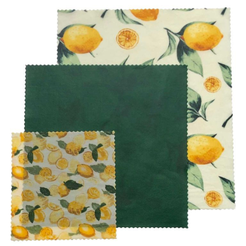 Ez a friss, citrom mintás méhviaszos kendő szett három különböző méretű kendőt tartalmaz, amelyek ideálisak a mindennapi élelmiszer-tároláshoz. A természetes pamut alapanyag méhviasszal, jojobaolajjal és fenyőgyantával kezelt, így a kendők légáteresztők, de megőrzik a zöldségek, gyümölcsök, sajtok, pékáruk és szendvicsek frissességét. Használat után hideg vizes öblítéssel könnyen tisztíthatók, és többször is újra felhasználhatók. A citromos desig