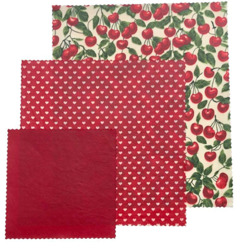 Ez a méhviaszos kendő szett három különböző méretű darabot tartalmaz, amelyek piros, szíves és cseresznyemintás mintával készültek. A kendők természetes pamutból, méhviasszal, jojobaolajjal és fenyőgyantával vannak bevonva, így lég áteresztők, ugyanakkor megőrzik az élelmiszerek nedvességtartalmát. Tökéletes választás zöldségek, gyümölcsök, sajtok, pékáruk vagy szendvicsek becsomagolására, valamint edények lefedésére. Használat után egyszerűen, hi