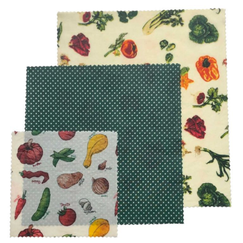 Ez a zöldséges és pöttyös mintákkal készült méhviaszos kendő szett három darabból áll, különböző méretekben. Ideális választás zöldségek, gyümölcsök, sajtok, kenyerek és szendvicsek becsomagolásához, valamint edények lefedéséhez. A kendők 100% pamut alapanyagból készültek, méhviasszal, jojobaolajjal és fenyőgyantával kezelve, így légáteresztők, mégis megőrzik az ételek nedvességtartalmát és frissességét. Hideg vizes öblítéssel könnyen tiszt