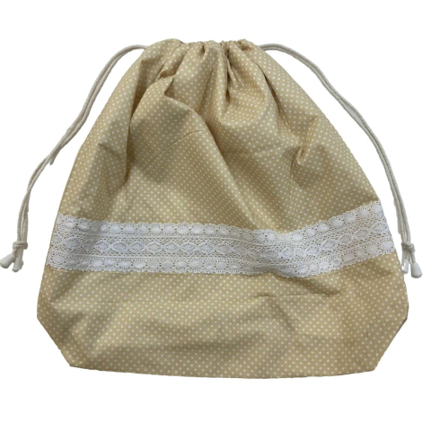 1 kép MK Bea Nagy cipós zsák – bézs alapon fehér pöttyös, csipkebetéttel