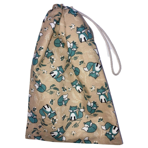 1 kép MK Bea Uzsonnás zsák – bézs alapon zöld rókás mintával, PUL béléssel