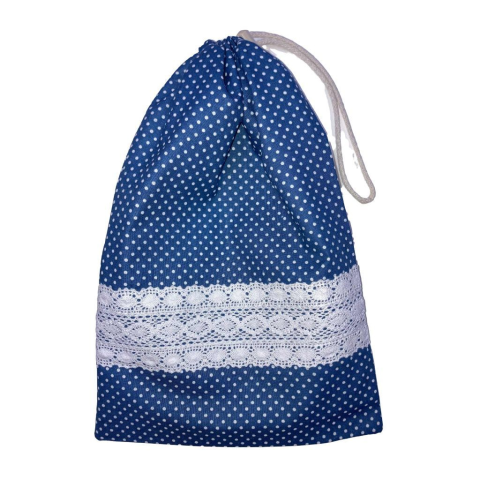 Ez a kék alapon fehér pöttyös, romantikus csipkebetéttel díszített uzsonnás zsák egyedi és elegáns választás a mindennapokra. Kiválóan alkalmas szendvicsek, péksütemények vagy gyümölcsök szállítására, de kisebb tárgyak tárolására is praktikus. Strapabíró pamut anyaga mosható és újra felhasználható, így környezetbarát alternatívát nyújt az egyszer használatos csomagolásokkal szemben. A behúzózár segítségével könnyen nyitható és zárható, bizto
