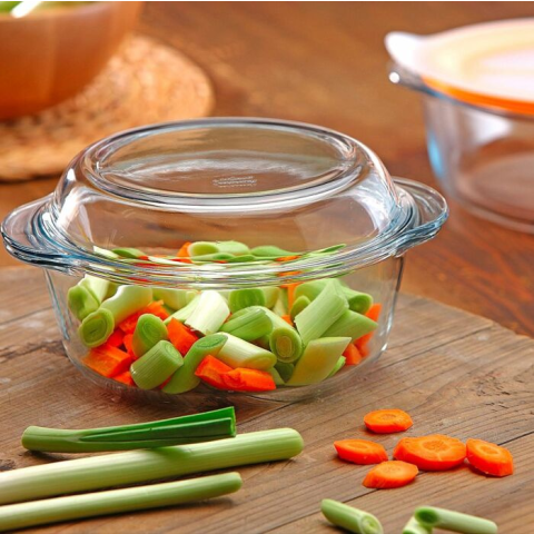 Kerek üveg pecsenyesütő fedővel 2,17 l, mechanikus és hőhatásokkal szemben rendkívül ellenálló kemény boroszilikát üvegből készül, melynek hőmérséklet-tartománya -40 és +300 °C között van.