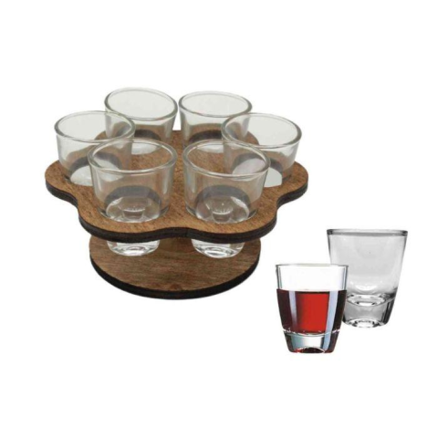 A szett tartalmaz hat darab, 40 ml-es üveg poharat, melyek pontosan illeszkednek a hozzá tartozó, masszív fa tartóállványba. A fa állvány stabilan tartja a poharakat, megkönnyítve azok szállítását és tárolását.