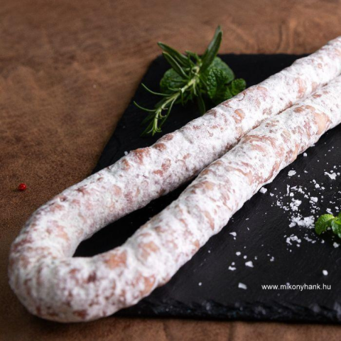 Hosszú érlelési folyamatának köszönhetően nemes penész borítja a kolbászt, mely ízében is egyedülállóvá teszi.