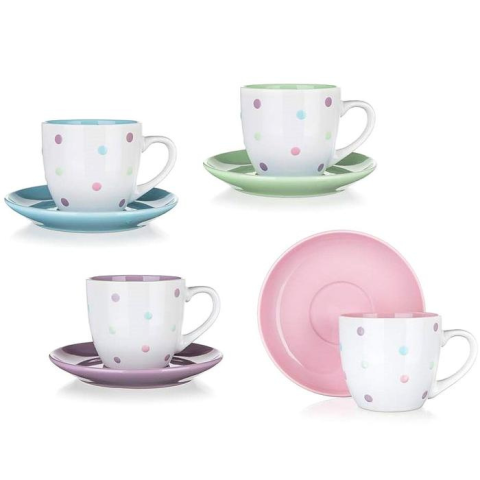 Készlet tartalma: 4 különböző színű pöttyös bögre + csészealj