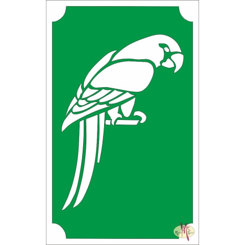 Jellemzői: Öntapadó festősablon papagáj mintával. Csillámtetováláshoz, arc és testfestéshez, henna festéshez, illetve textil, vagy tárgyak díszítéséhez ajánljuk. A festő sablon három rétegből áll: a matrica alap hordozója (általában fehér színű) maga az