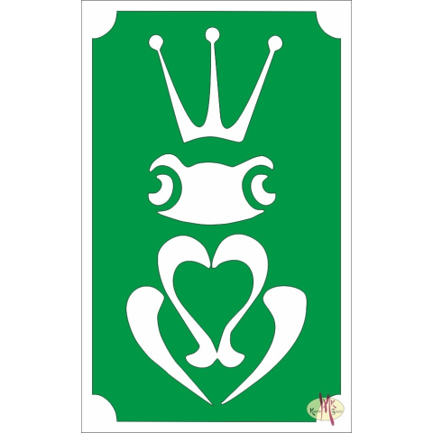 8x5 cm-es Csillámtetoválás sablon - Béka királyfi A sablon három rétegből áll, mely hennafestésre, arcfestésre, csillámfestésre és csillámtetoválásra is alkalmas. A rétegek: - a matrica hordozója (fehér színű) - maga az öntapadós matrica (színes s