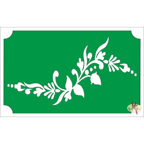 Jellemzői: Csillámtetoválás festő sablon, indás virágokminta. Méret: bruttó 8x5cm (körbe 2-2 mm keret) A sablon három rétegből áll, mely hennafestésre, arc és testfestésre, csillámtetoválásra, textil és üvegfestéshez is alkalmas. A rétegek: - a matrica
