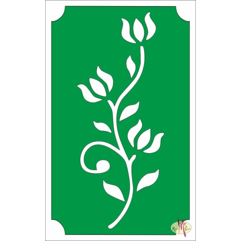 Jellemzői: Csillámtetoválás festő sablon, trópusi virág inda mintával. Méret: bruttó 8x5cm (körbe 2-2 mm keret) A sablon három rétegből áll, mely hennafestésre, arc és testfestésre, csillámtetoválásra, textil és üvegfestéshez is alkalmas. A rétegek: -