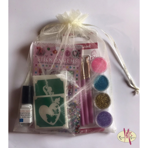 Ebben a készletben lányos mintájú sablonokat állítottunk össze, csillámtetoválás ragasztót, csillogó színeket tartalmazó csillámporokat, 3 darabos ecset készletet. Továbbá strasszköveket és flittereket. Mindezeket organza tasakba csomagoltuk neked. Hogy