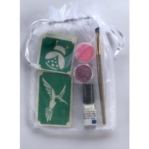 Hogy mit tartalmaz a csillámtetkó szett? 15 db testfestő sablon, random, véletlenszerűen választott lányos mintákkal, a képen lévőtől eltérhet 10 db 5x5 cm-es, és 5 db 8x5 cm-es 1 db csillámtetoválás ragasztót, ez a csillámtetkó alapterméke 2 db kozmet