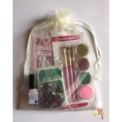 Ebben a készletben virágos mintájú sablonokat állítottunk össze, csillámtetoválás ragasztót, csillogó színeket tartalmazó csillámporokat, 3 darabos ecset készletet. Továbbá strasszköveket és flittereket. Mindezeket organza tasakba csomagoltuk neked. Hog