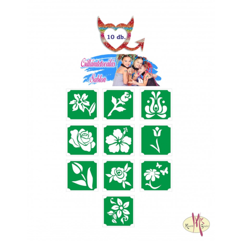 Jellemzői: 10 db random választott sablon kedvelt virág mintákkal. sablon méret: bruttó 5x5 cm-es A sablon három rétegből áll, mely hennafestésre, arc és testfestésre, csillámtetoválásra, textil és üvegfestéshez is alkalmas. sablon rétegek: a matrica h