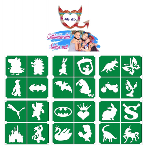 Jellemzői: 6 db. 4 az egyben sablon. Összesen 24 sablon minta Sablon méret: 8x8 cm - 4 db 39,2 mm-es minta A sablon három rétegből áll, mely hennafestésre, arc és testfestésre, csillámtetoválásra, textil és üvegfestéshez is alkalmas. sablon rétegek: a