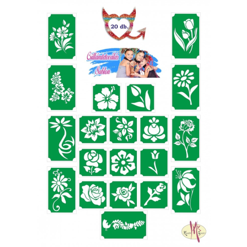 Jellemzői: 20 db random választott sablon kedvelt virágos mintákkal. sablon méret: bruttó 5x5 cm-es 11 darab, 8x5 cm 9 darab. A sablon három rétegből áll, mely hennafestésre, arc és testfestésre, csillámtetoválásra, textil és üvegfestéshez is alkalmas.