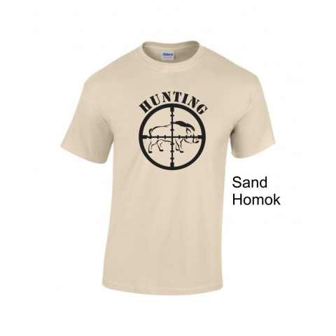 körkötött, környakas, rövid ujjú uniszex póló Vadászat témában anyaga 100% pamut 185 g/m2 (175 gr/m2 fehér) S-3XL méretekig választható varrás nélküli, duplán tűzött nyakkivágás válltól-vállig pántos kitéphető címke gyűrődésmentesítő behajtás 10 színbe