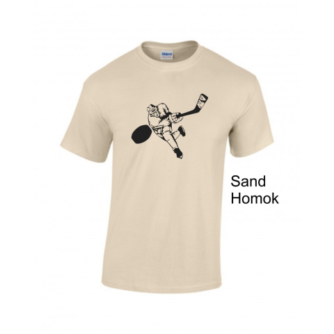 körkötött, környakas, rövid ujjú uniszex póló Jégkorongos témában anyaga 100% pamut 185 g/m2 (175 gr/m2 fehér) S-3XL méretekig választható varrás nélküli, duplán tűzött nyakkivágás válltól-vállig pántos kitéphető címke gyűrődésmentesítő behajtás 10 szí