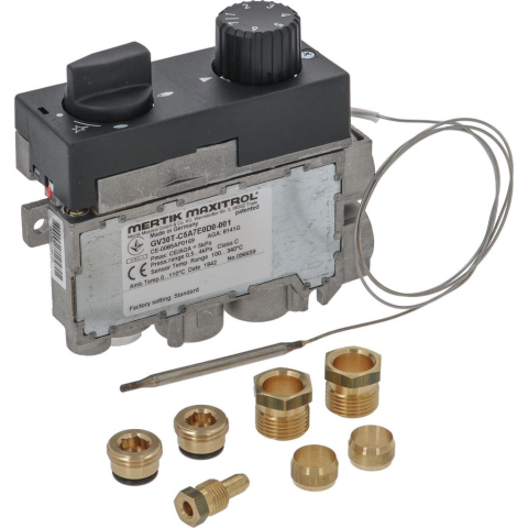modell GV30T-C5A7E0D0-001 | bemenet ø 3/8'F - kimenet ø 3/8'F | termoelektromos csatlakozás M8x1 | gáznak maximális bemeneti nyomás 50 mbar | kapilláris hosszúság 720 mm | izzó ø 4x68 mm | gombbal, maszkkal és csatlakozókkal ellátva Az alábbi típusokho