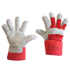 Munkáskesztyű, hasított tehénbőrből és piros pamut szövetből.