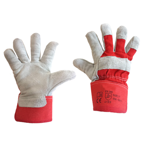 Munkáskesztyű, hasított tehénbőrből és piros pamut szövetből.