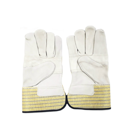 Munkáskesztyű, tehénbőrből (nappa) és sárga / kék-csíkos pamut szövetből.