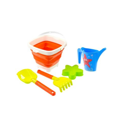 A vízparti vagy kerti homokozások alkalmával előfordul, hogy szőrén-szálán eltűnnek a homokozójátékok... De nem akkor, ha a homokozószett mellett egy összecsukható vödör is kéznél van! A csomagban található tengeri csillag mintával díszített locsolókanna, a gereblye, a lapát és a csillag alakú homokozóforma mind kényelmesen beleférnek a praktikus, fogantyúval ellátott vödörbe, így a gyerekek bárhová magukkal vihetik őket. Amíg a lurkók kedvükre építen