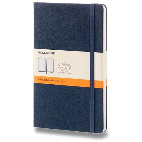 Jegyzetfüzet - A5 formátum, 120 lapos, vonalas papír, kemény kötés, karton borítóval, varrott gerinccel, gumiszalaggal, tárolózsebbel, kék kivitel Zápisník MOLESKINE je ideální na zapisování poznámek, myšlenek, cílů i plánů. Opatřený je pevnou vazbou a pružnou páskou, která zamezí jeho samovolnému otevírání. Nechybí ani pořadač poznámek