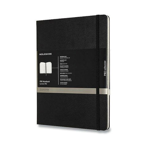 Jegyzetfüzet - B5 formátum, 192 lapos, vonalas papír, kemény kötés, karton borítóval, varrott gerinccel, gumiszalaggal, textil könyvjelzővel, tárolózsebbel, fekete kivitel Stylový zápisník MOLESKINE Professional XL je skvělým spojením vlastností diáře i zápisníku. Dny a data doplníte podle vašich potřeb, díky čemuž lze použít pro každý den libovolný počet stran.