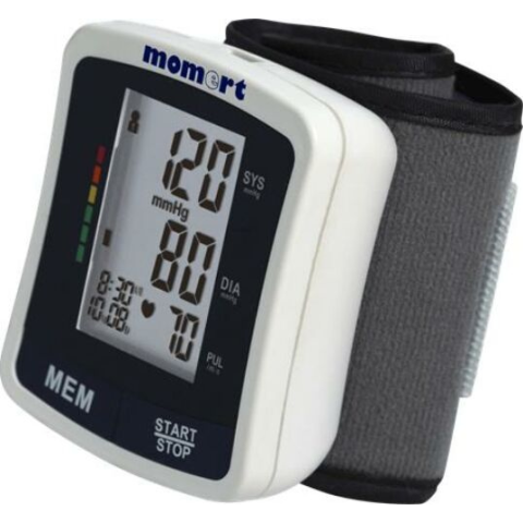Csuklóra helyezhető vérnyomásmérő LCD kijelzővel -szisztolé / diasztolé / pulzus / dátum / időpont adatokkal -120 memóriahely -átlagérték számítás az utolsó 3 mért értékből -szabálytalan szívverés kijelzése -méréstartomány: nyomás: 0-300 mmHg, pulzus: 30-180/perc -mandzsettahossz: 135-215 mm-es csuklókerülethez -energiaforrás: 2x AAA elem (tartozék) Gyártó/első EU forgalmazó elérhetősége: Momert Zrt 2400 Dunaújváros, Papírgyári út 12-14. info@mome