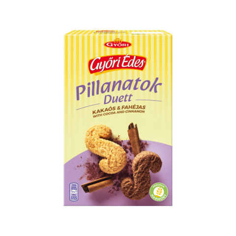 Győri Édes Pillanatok 220g Kakaós-Fahéjas - Duett Rövid leírás A Győri Édes Pillanatok Duett 220 g-os kiszerelése egy különleges ropogós nassolnivaló, amely a kakaó gazdag ízét fahéj meleg jegyével ötvözi. Fergetes kombináció, amely minden alkalomra