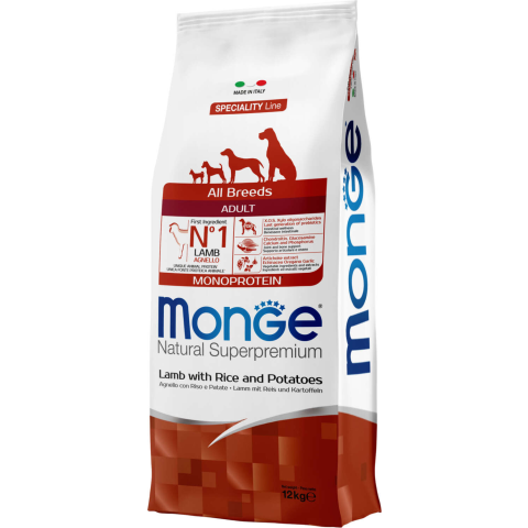 Monge Speciality Line Dog Adult Monoprotein Lamb with Rice & Potatoes teljes értékű állateledel felnőtt kutyák számára. Fő összetevője a bárányhús, ami könnyen emészthető és a hozzáadott friss húsnak köszönhetően nagyon ízletes. Kizárólag egyféle állati eredetű fehérjét tartalmaz. A termék xylo-oligoszacharideket és probiotikumokat tartalmaz, amik támogatják a megfelelő emésztést. Glükózamint és kondroitin-szulfátot is tartalmaz az ízületek é