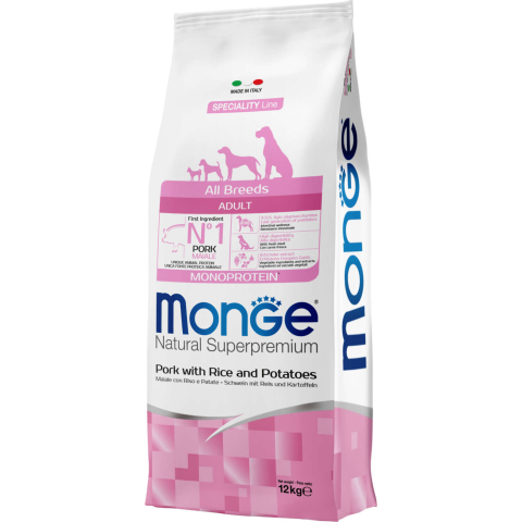Monge Speciality Line Dog Adult Monoprotein Pork with Rice & Potatoes teljes értékű állateledel felnőtt kutyák számára. Fő összetevője a sertéshús, ami könnyen emészthető és a hozzáadott friss húsnak köszönhetően nagyon ízletes. Kizárólag egyféle állati eredetű fehérjét tartalmaz. A termék xylo-oligoszacharideket és probiotikumokat tartalmaz, amelyek támogatják a megfelelő emésztést. Glükózamint és kondroitin-szulfátot is tartalmaz az ízülete