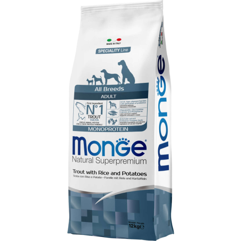 Monge Speciality Line Dog Adult Monoprotein Trout with Rice & Potatoes teljes értékű állateledel felnőtt kutyák számára. Fő összetevője a pisztráng, ami könnyen emészthető és a hozzáadott friss húsnak köszönhetően nagyon ízletes. Kizárólag egyféle állati eredetű fehérjét tartalmaz. A termék xylo-oligoszacharideket és probiotikumokat tartalmaz, amelyek támogatják a megfelelő emésztést. Glükózamint és kondroitin-szulfátot is tartalmaz az ízületek