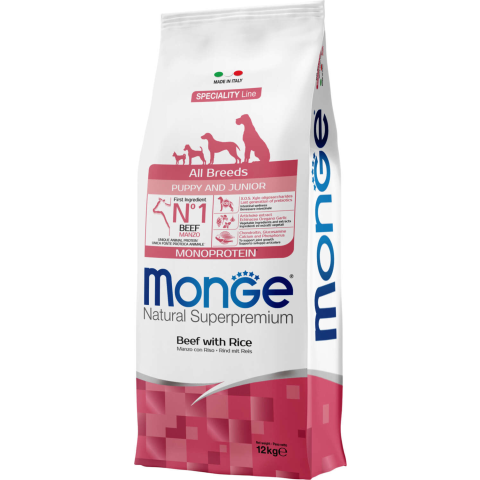 Monge Speciality Line Dog Puppy & Junior Monoprotein Beef with Rice teljes értékű kölyöktáp. Fő összetevője a marhahús, ami könnyen emészthető és a hozzáadott friss húsnak köszönhetően nagyon ízletes. Kizárólag egyféle állati eredetű fehérjét tartalmaz. A termék xylo-oligoszacharideket és probiotikumokat tartalmaz, amelyek támogatják a kölyökkutyák megfelelő emésztést. Glükózamint és kondroitin-szulfátot is tartalmaz az ízületek és csontok eg