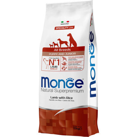 Monge Speciality Line Dog Puppy & Junior Monoprotein Lamb with Rice teljes értékű kölyöktáp. Fő összetevője a bárányhús, ami könnyen emészthető és a hozzáadott friss húsnak köszönhetően nagyon ízletes. Kizárólag egyféle állati eredetű fehérjét tartalmaz. A termék xylo-oligoszacharideket és probiotikumokat tartalmaz, amelyek támogatják a kölyökkutyák megfelelő emésztést. Glükózamint és kondroitin-szulfátot is tartalmaz az ízületek és csontok