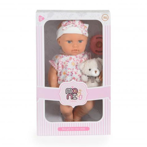 Baba 30cm újszülött Maciruhában Kisnyuszival Pink MBN-111799. Baba, 30 cm-es, mellékelt kiegészítőkkel - cumival és kis plüss macival.A fej, a karok és a lábak kiváló minőségű vinilből készülnek, amely puha és kellemes tapintású, kényelmes játék közben.A 18 hónaposnál idősebb gyermekek számára készült baba biztonságos és kiváló minőségű anyagokból készült, így több órányi szórakozást és biztonságos ját