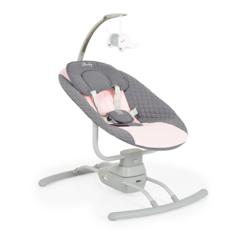 Elektromos hinta Rocky ; 0m+-tól 9 kg-ig használható; Használható kidobóként; 3 lengési sebesség; Az 5 pontos biztonsági öv puha protektorral gondoskodik a biztonságról; 8 dallam; Különböző hangerőre állítható; Játékruda 1 puha játékkal, fejleszti a vizuá
