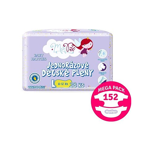 Eldobható pelenka - hagyományos pelenka és öko pelenka, méret L, gyermek súlya 8 - 12 kg, 152 darab a csomagban, megfelelő pozícióban tartja a csípőt, ergonómikus abszorbens mag, szagsemlegesítő, hipoallergén, rugalmas szalag, extra légáteresztő, parfümmentes és klórmentes, MonPeri Klasic Mega Pack sorozat Ha olyan eldobható pelenkát keresel gyermeked számára, amely kíméletesen bánik az érzékeny bőrével, a MonPeri Klasik pelenka biztosan nagyszerű választás les