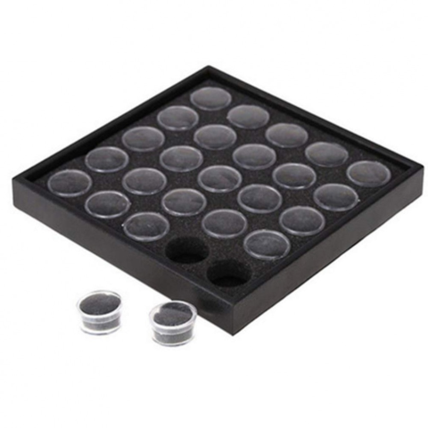 Jellemzői: Csillámporok, díszek, díszítők, ékek, strasszok tárolására, rendszerezésére alkalmas gyűjtő doboz. Szivacsos védelem 25 db tégely Szín: fekete A tégelyek üresek, nem csavaros a tető
