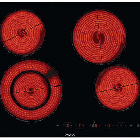 Főzőlap - kerámialapos, beépíthető, 4 főzőzóna, gyerekzár, folyamatos teljesítményszabályozás és maradékhő jelzés, időzítő, érintéses vezérlés, csiszolt élek, keret nélküli, fekete üveg kivitel, üveg felület, 400 V csatlakozás, mérete 59 × 52 × 5,1 cm (Sz×Mé×Ma), a készülék csatlakoztatásához villanyszerelő szükséges MORA VDST 632 C főzőlapA fekete kivitelű, csiszolt élekkel rendelkező MORA VDST 632 C üvegkerámia főzőlap 4 Hi-Light főzőzó