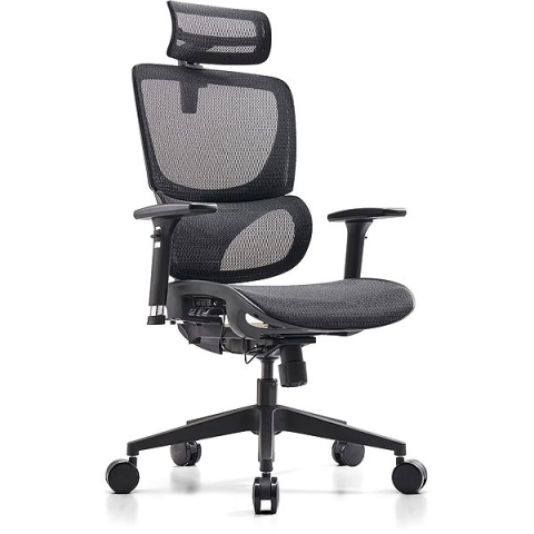 Irodaszék - forgó és ergonomikus aszinkron mechanikával, terhelhetősége 136 kg, rögzíthető pozíció, anatómiailag formázott ülőke állítható magassággal, deréktámasz, állítható magasságú fejtámla, kárpitozott kartámasz kartámasz állítható jobbra/balra, előre/hátra, függőlegesen, műanyag görgők 6 cm átmérővel, műanyag konstrukció, huzat anyaga hálós anyag, lábak anyaga fém, mérete 68 × 68 cm (Sz×Mé), a vevőnek kell összeszerelni, tömege 21,5 k
