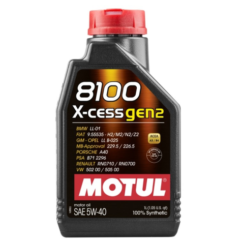 Motul 8100 X-Cess Gen2 hagyományos, hosszú csereperiódusú 5W-40 viszkozitású motorolaj Nagy teljesítményű, 100%-ban szintetikus kenőanyag, amelyet kifejezetten nagy teljesítményű, nagy lökettérfogatú benzin- és dízelmotorral, szívó vagy turbófeltöltőve