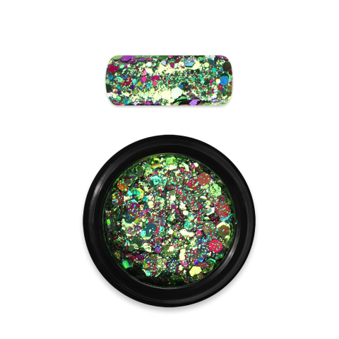 Különlegesen szép és csillogó, intenzív holografikus fénnyel ragyogó finom őrlésű csillámpor és hexagon glitter keveréke.
