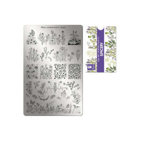 MOYRA - NYOMDALEMEZ - NYOMDALEMEZ - Spicery - 91 A Spicery körömnyomda lemez természetes és könnyed, virágos és leveles mintákkal van tele, melyeket lenyomdázhatsz önmagukban vagy akár k A Spicery körömnyomda lemez természetes és könnyed, virágos és le