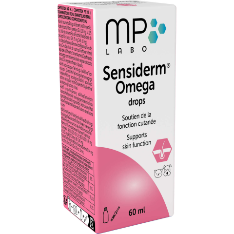 MP Labo Sensiderm Omega bőrtápláló olaj – orális szuszpenzió adagolófecskendővel a bőrfunkciók támogatására kutyák és macskák részére. Biztosítja a bőr táplálásához szükséges esszenciális tápanyagokat, ápolja a bőrt és erősíti a bőr barrier funkcióját különféle bőrelváltozások esetén, illetve hozzájárul a szőrzet szépségéhez. Az EPA, a DHA (omega-3 zsírsavak) és a GLA (omega-6 zsírsav) modulálja a bőrreakciót. A vitaminokból és c