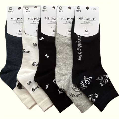 MR PAMUT Női kutyás mintás zokni – 5 pár/csomag Ez az 5 párból álló női zokni szett aranyos kutyás mintákkal érkezik, többféle színkombinációban. A vidám állatminták játékos és nőies megjelenést kölcsönöznek a mindennapi viselethez. A pamut tartalmú anya