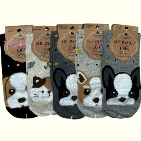 MR PAMUT Női mintás bokazokni – Állatos, 5 pár Aranyos állatmintás női bokazokni – puha és kényelmes viselet, játékos kutya és cica mintákkal a lábfejen. A zokni sarka és szára között kb. 17 cm hosszú (kézi mérés, kis eltérés lehetséges), így jól