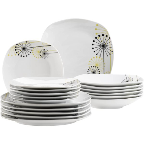 Étkészlet - 18 darabos készlet, a készlet tartalma 6 lapos tányér, 6 mély tányér, 6 desszert tányér, anyaga porcelán, mintás, mosogatógépbe és mikrohullámú sütőbe helyezhető A tányérok elengedhetetlen kellékei minden háztartásnak. A Domestic Vanesa szett 18 porcelán tányért tartalmaz pitypang motívummal - 6 mélytányér, 6 lapos tányér és 6 desszertes tányér. Az összes tány