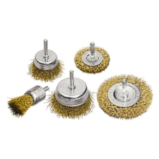 Hullámkreppelt tengelyre szerelt kefe készlet, kefekorong 50-75 mm + kehely 75mm, 5 db// MTX 4044996071947 A MATRIX 744929 kefe készletet fúróval történġ használatra tervezték. Csiszolásra, polírozásra, lakkotól, festéktġl való tisztításra és különféle